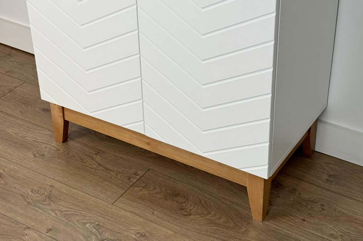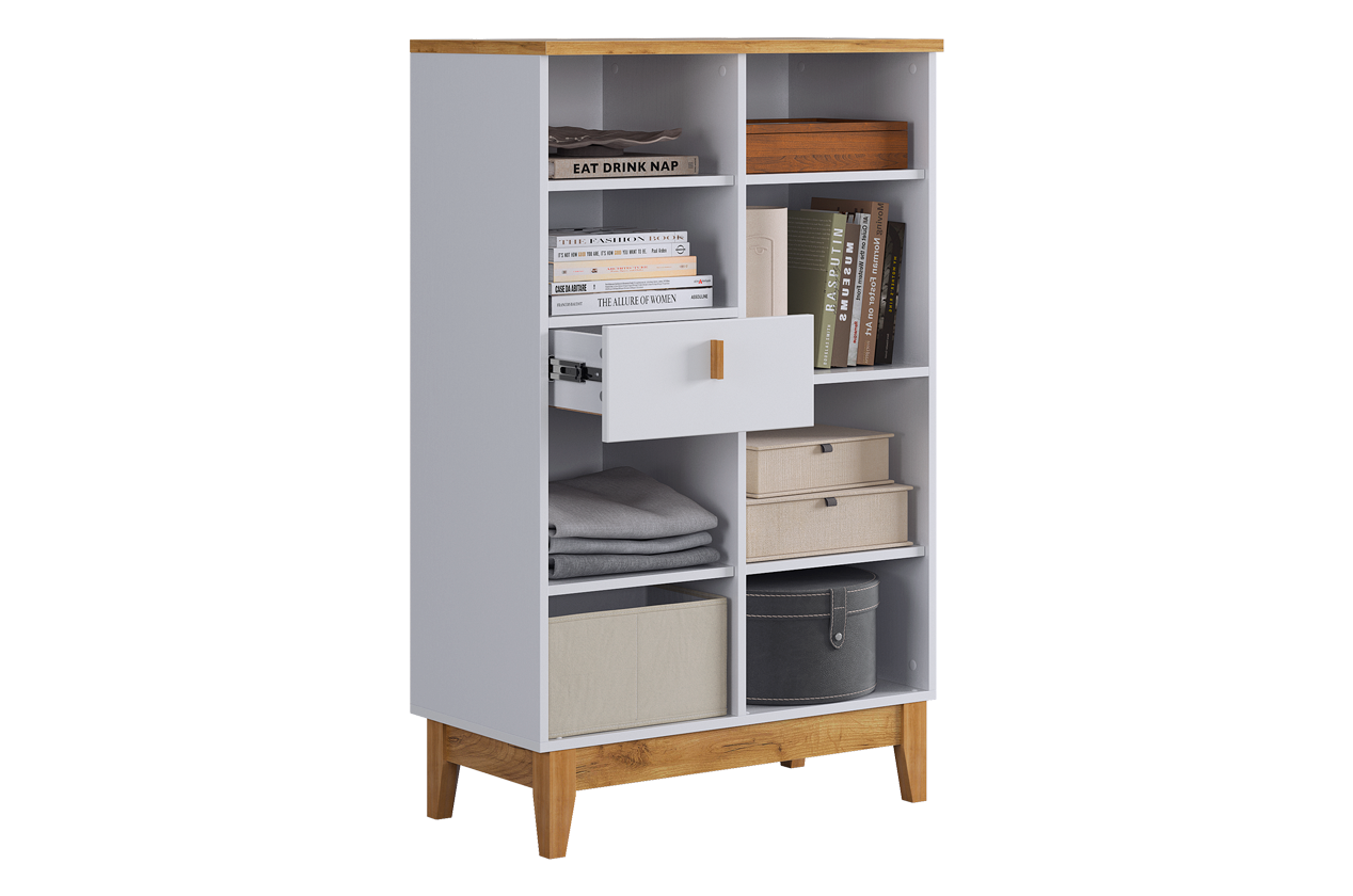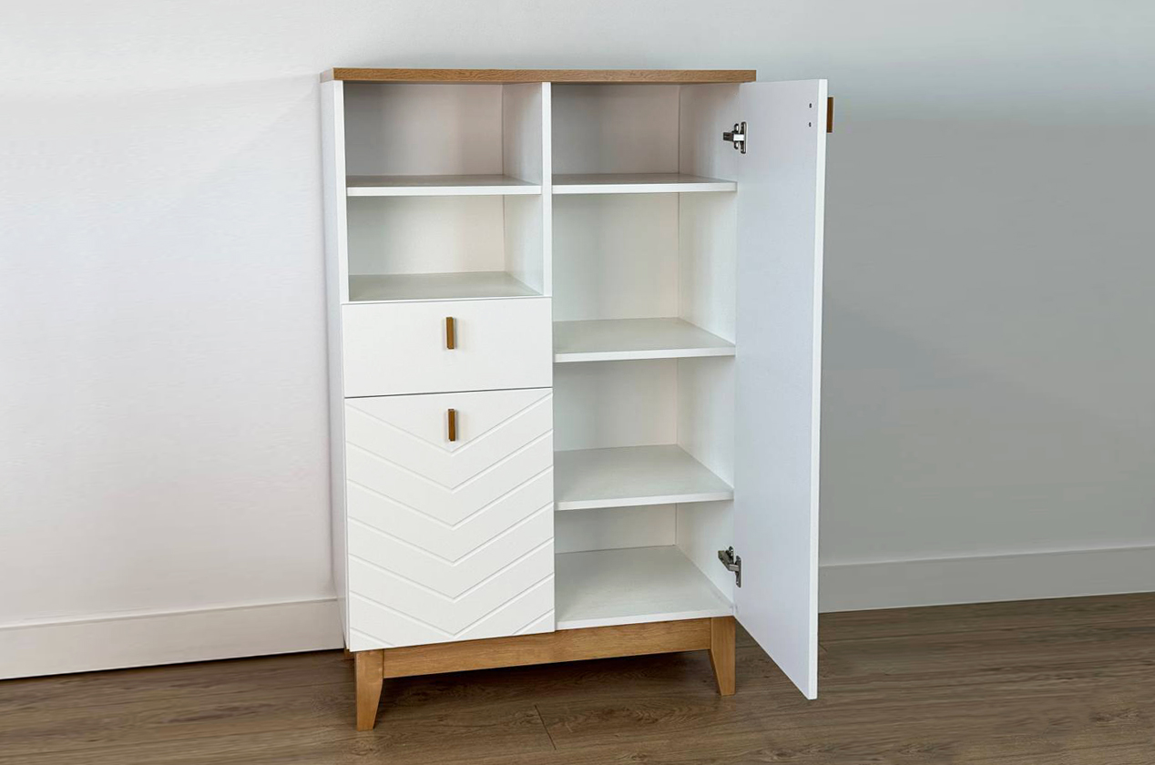 Асимметричный комод в скандинавском стиле, предлагающий комбинированную систему хранения. Модель идеально подходит для организации порядка в гостиной, спальне или прихожей, сочетая открытые и закрытые секции для максимальной функциональности.