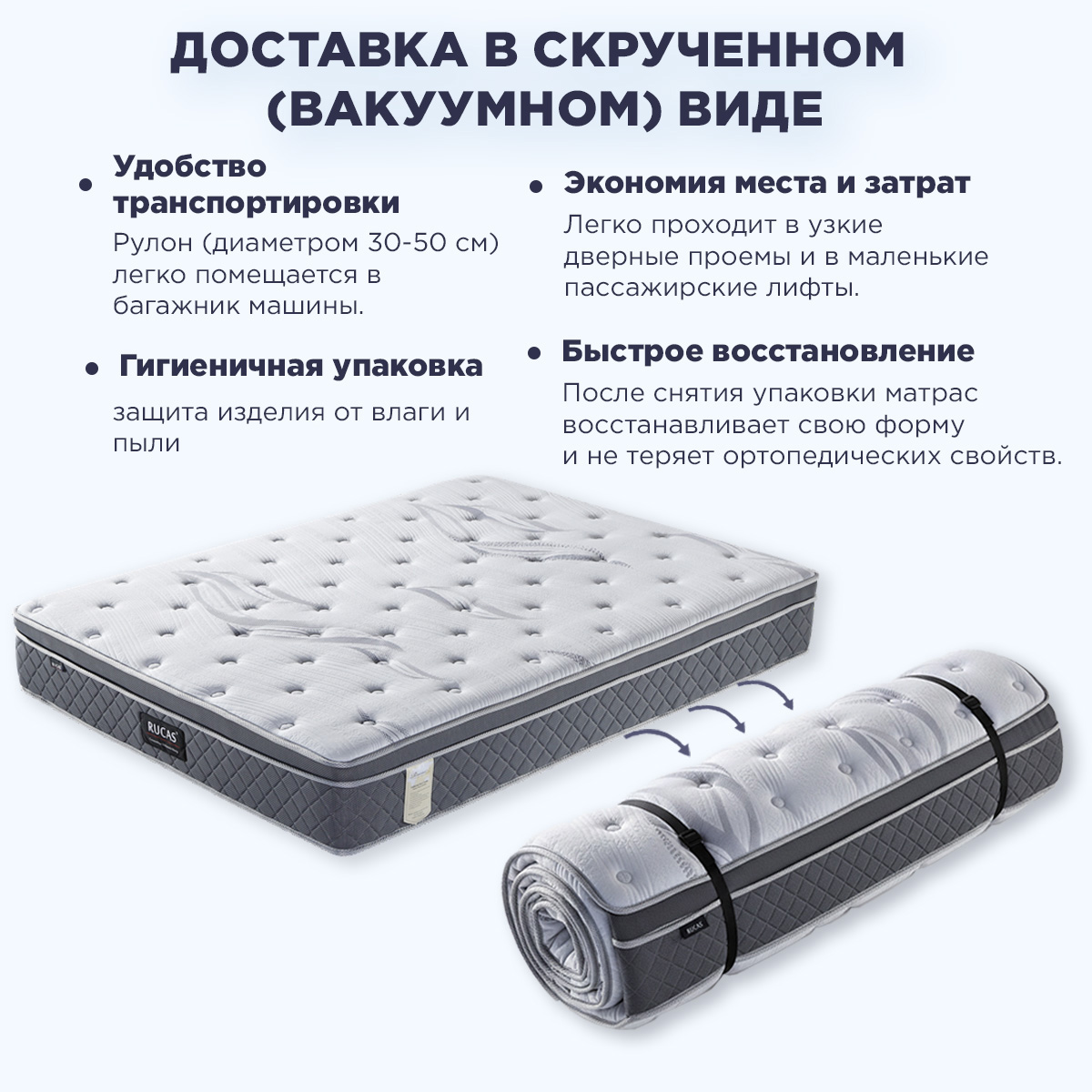 ✓ Умная доставка в вакуумной упаковке, матрас поставляется свернутым в компактный рулон: